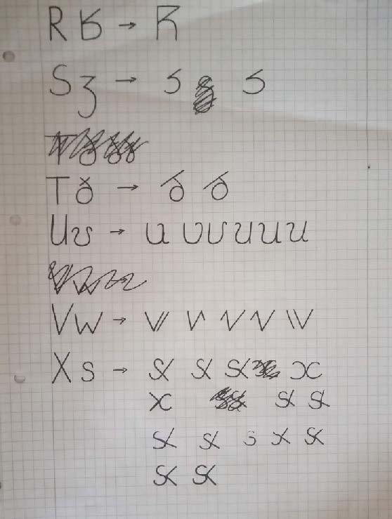 Um die Kombination vorzunehmen, wurden im Skelettmorphing die Grundstrukturen eines Klangpaares zu einem neuen Zeichengerüst vereint. Anschließend werden die entstandenen Zeichen in die Formsprache der Ausgangsfont »Noto Serif« übersetzt.