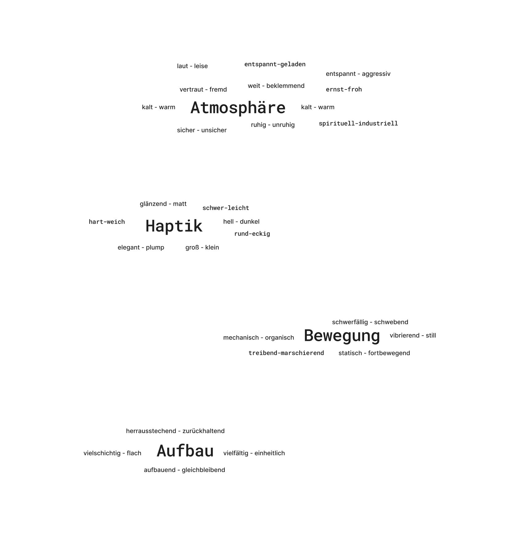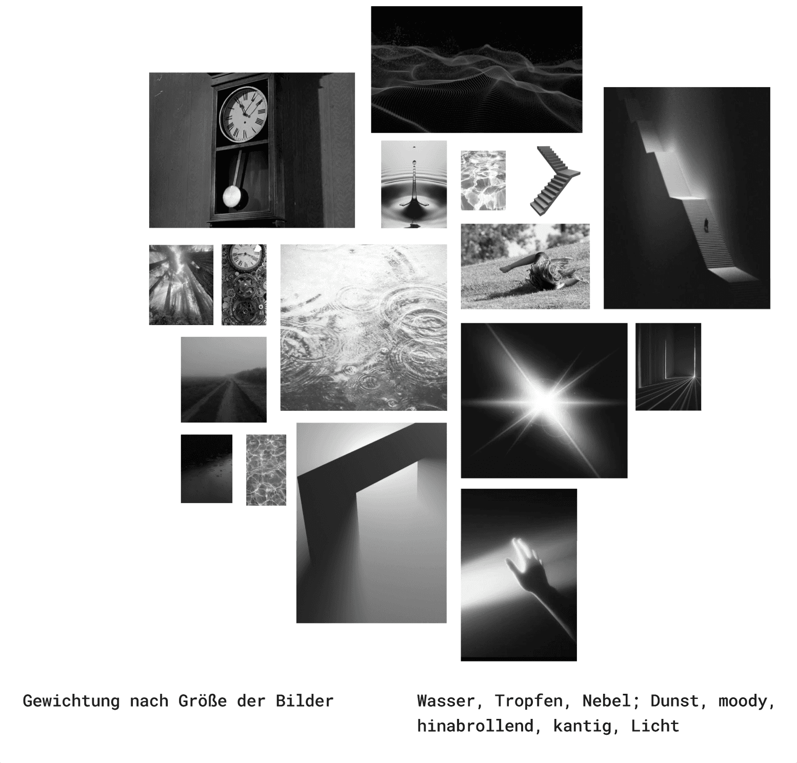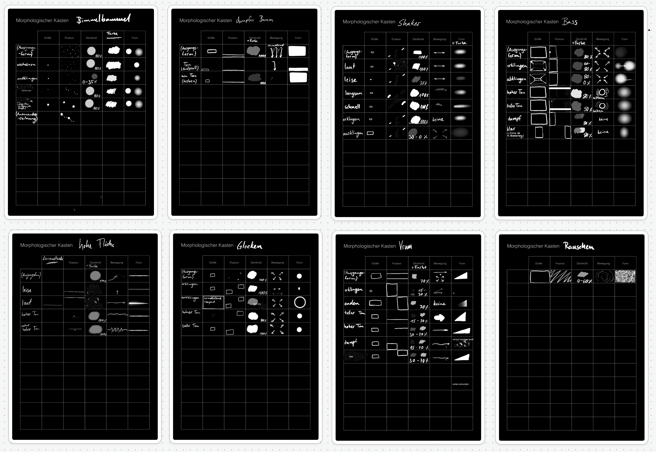 Zu Beginn haben wir uns auf einen geeigneten Songausschnitt geeinigt. Jeder von uns sammelte nun Assoziationen zum Track, um dessen Charakter greifbarer zu machen. Präzise erfassten wir Instrumente, Klangfarben und deren zeitlichen Einsatz. Ziel war es, die Struktur besser zu verstehen und eine fundierte Grundlage für die visuelle Übersetzung zu schaffen. Darauf aufbauend entwickelten wir für jedes Instrument passende visuelle Entsprechungen, in Form, Farbe und Bewegung, um seinen Charakter im Zusammenspiel zu übersetzen.